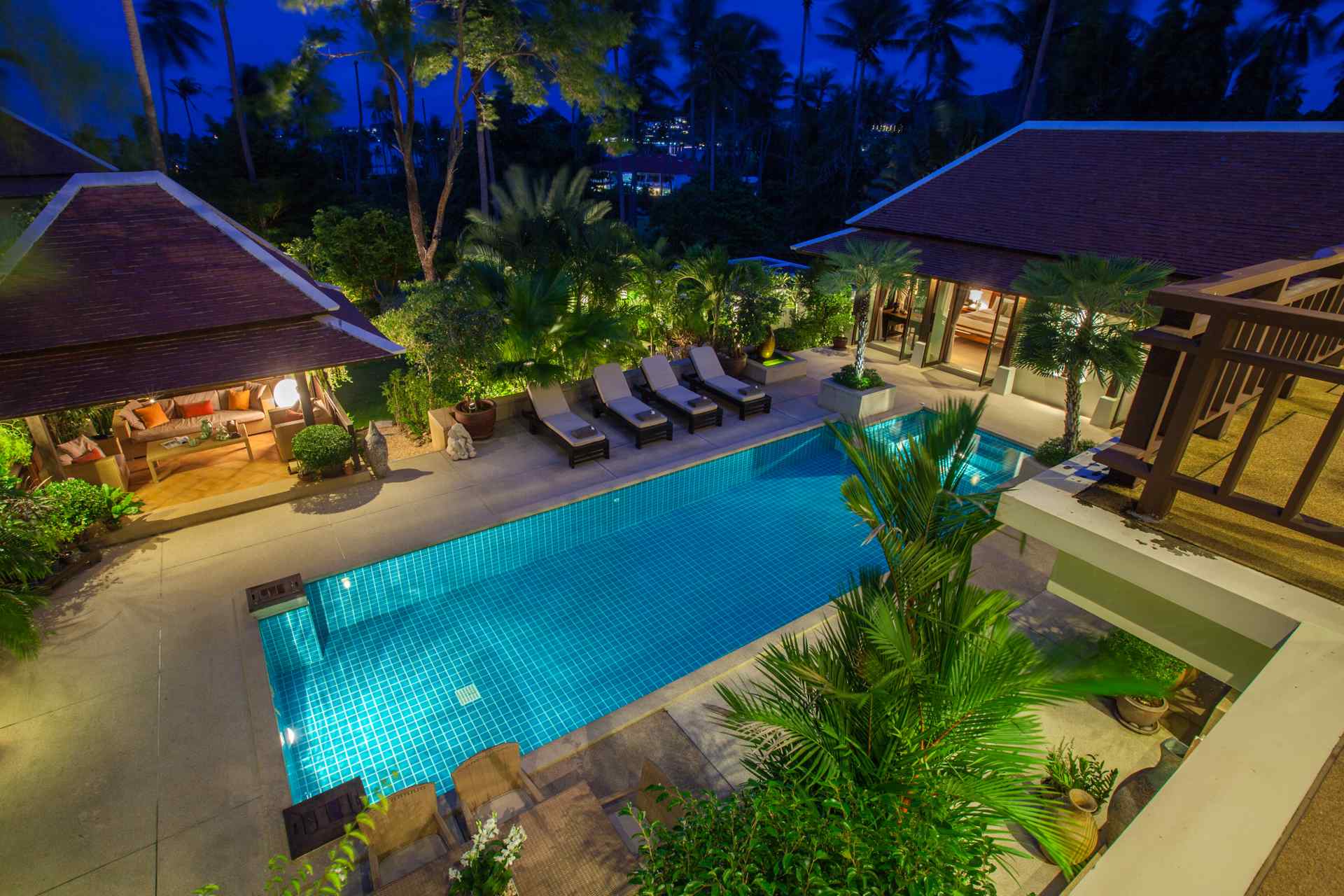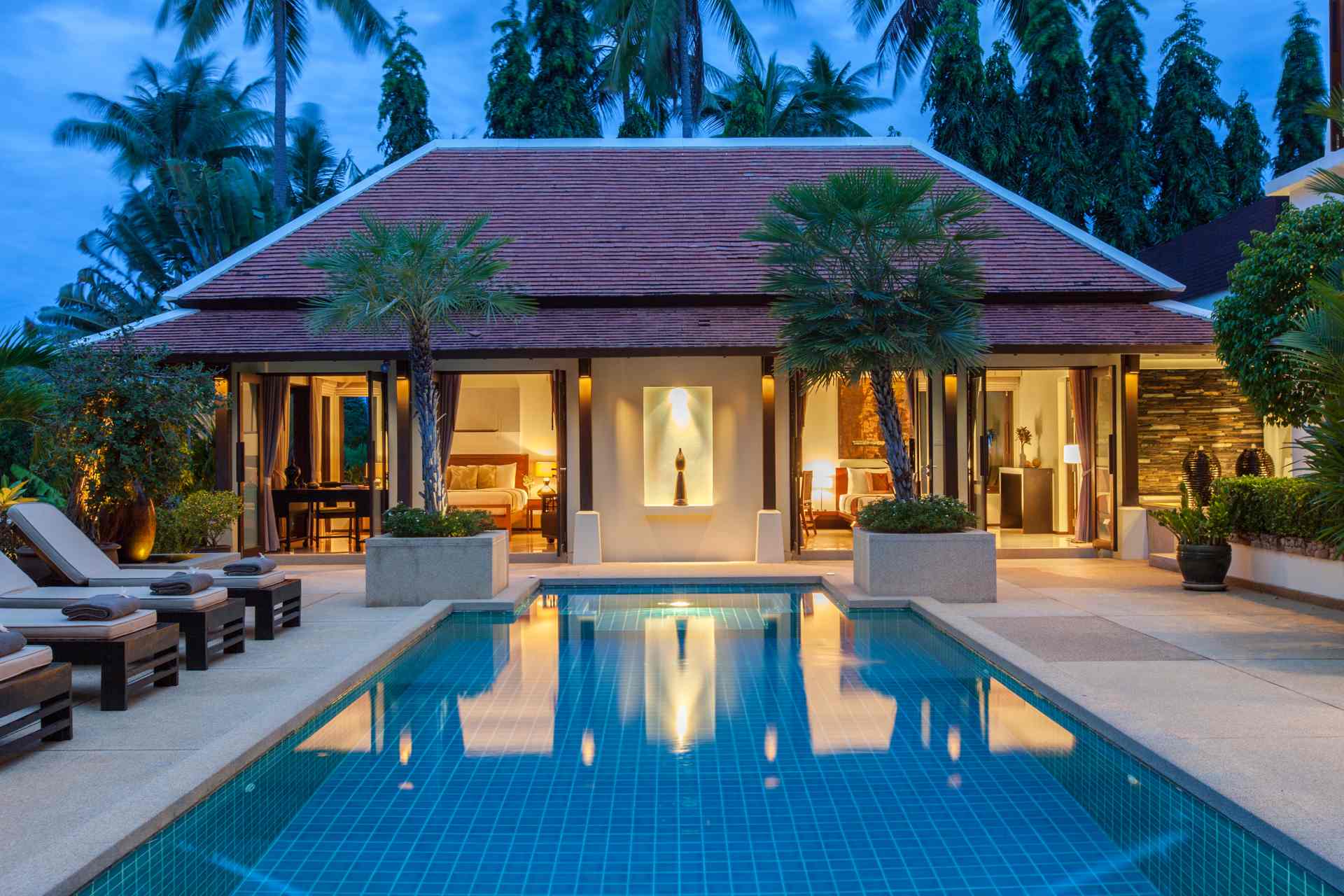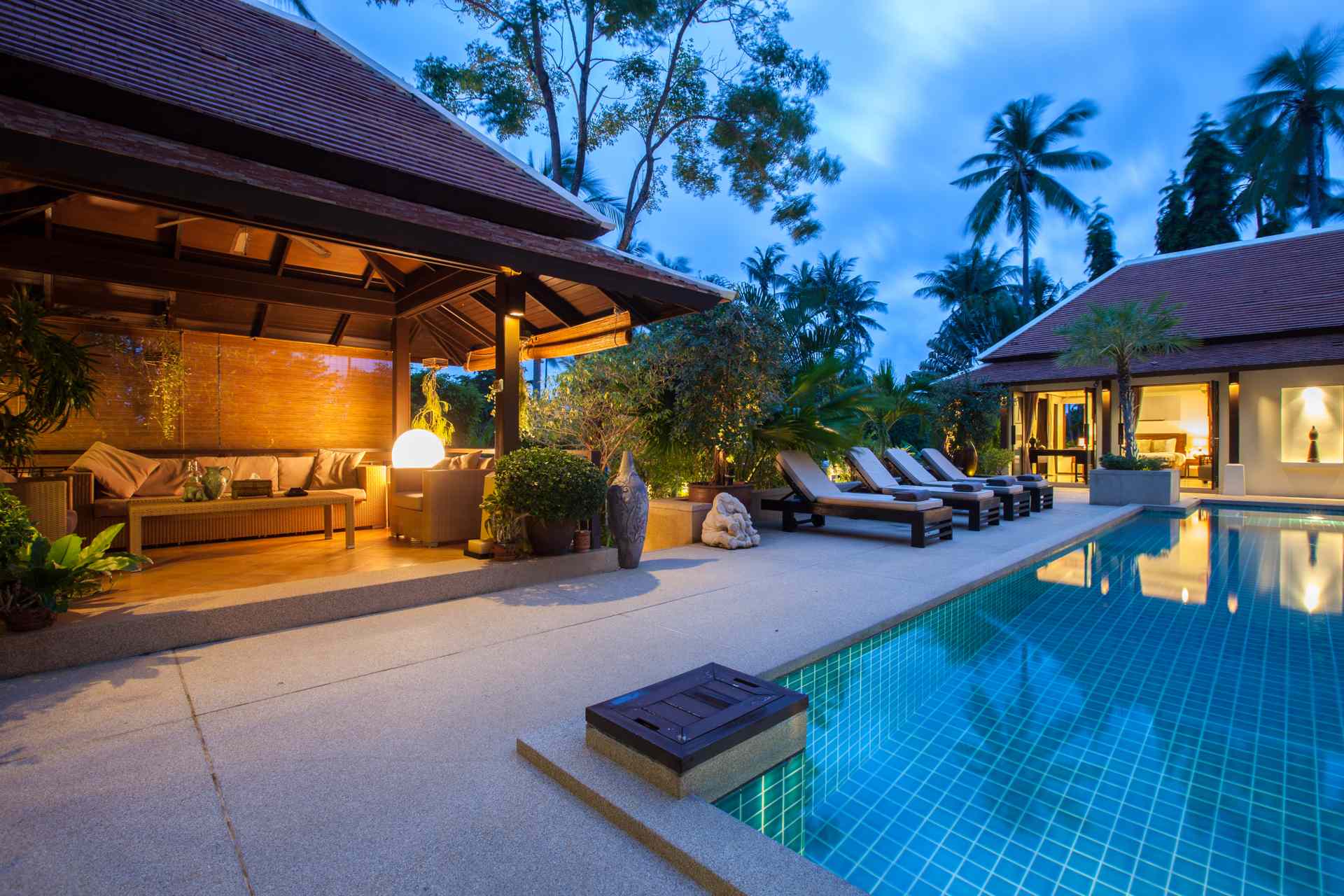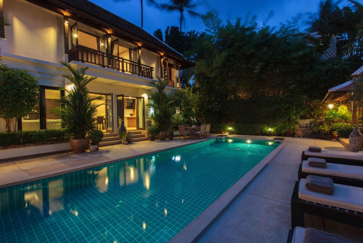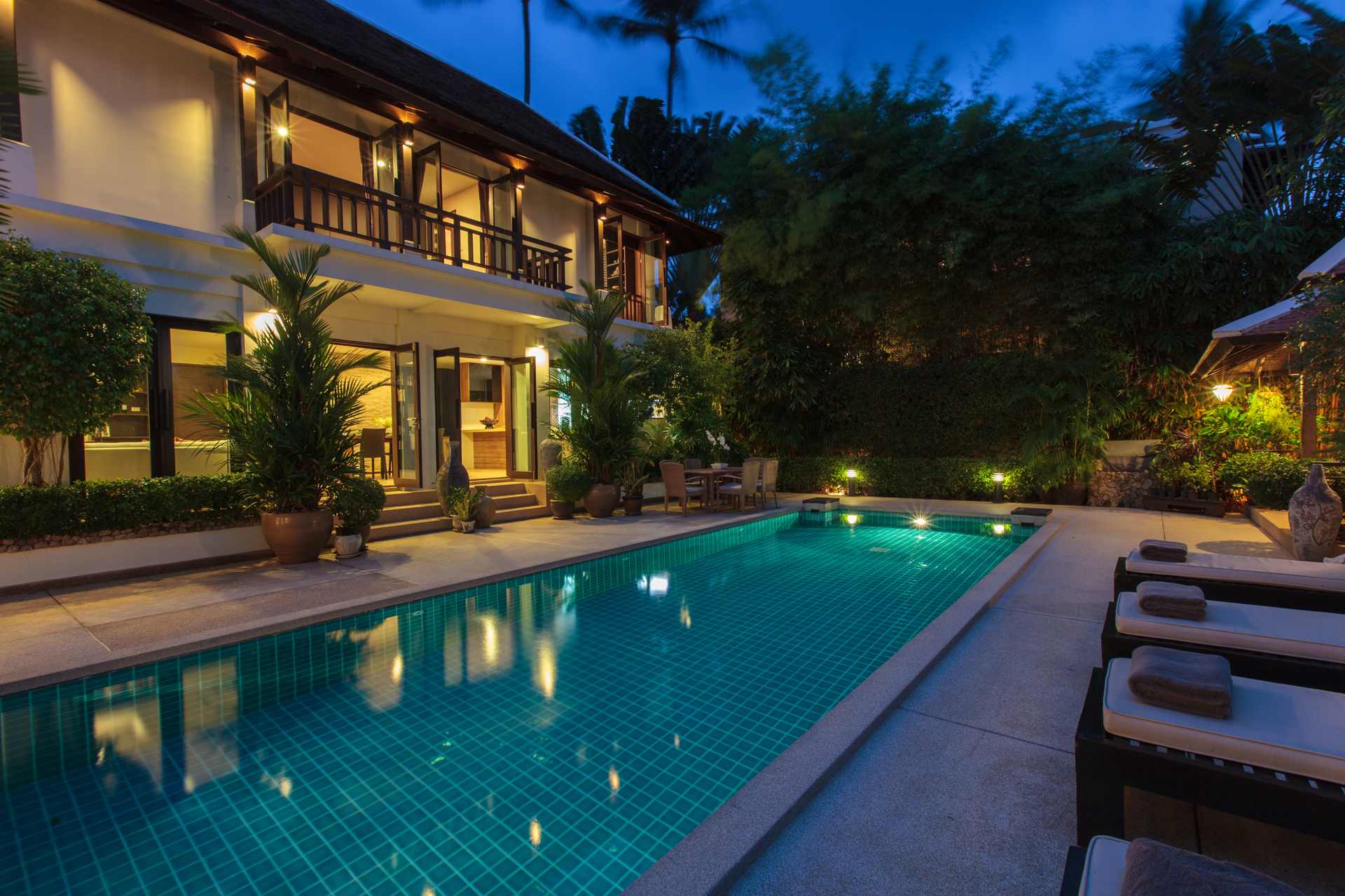 Modern and elegant, Villa sits within a gorgeous landscaped garden. Featuring stylish interiors and fine facilities, it serves as an ideal accommodation choice for families and couples. 150 meters to the beach. Located within close proximity to an array of renowned attractions like the Big Buddha statue, shops, nightlife spots and restaurants. Gorgeous landscaped garden. Ideal for accommodating families and couples. Cozy interiors designed in a contemporary style. The spacious outdoor compounds of the villa feature a sparkling pool flanked by sun loungers, beautiful outdoor furniture, a breezy pavilion and plenty of tropical greenery.